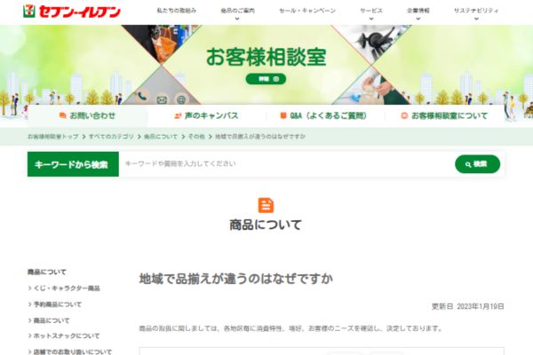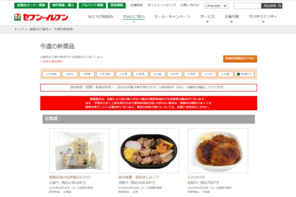 セブンイレブン公式ページでは商品ごとに地域区分表が用意され、北海道・東北・関東などエリアごとに販売の有無が記載されます。